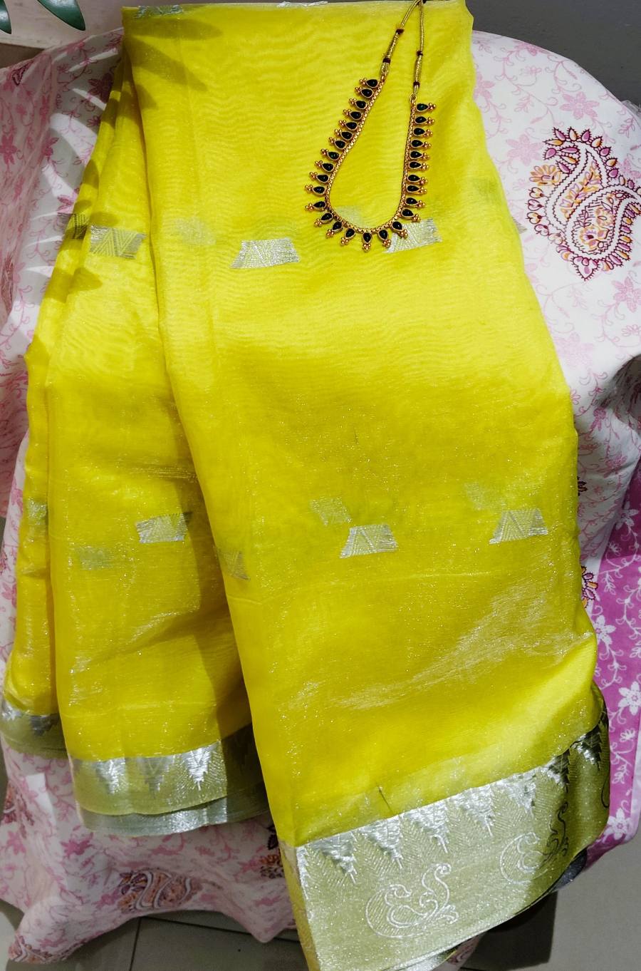 Crafted from lightweight organza fabric, this saree provides a crisp texture and effortless drape, ensuring both comfort and style. Its bright and cheerful yellow shade makes it a perfect choice for festive occasions, celebrations, and special gatherings.