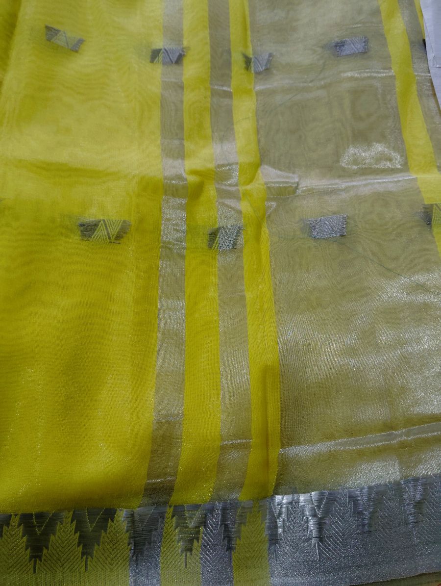 Stunning bright yellow organza saree featuring delicate geometric buttas and a rich silver zari border. Lightweight and perfect for festive elegance.
