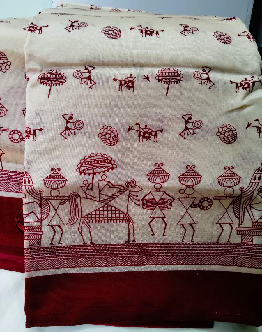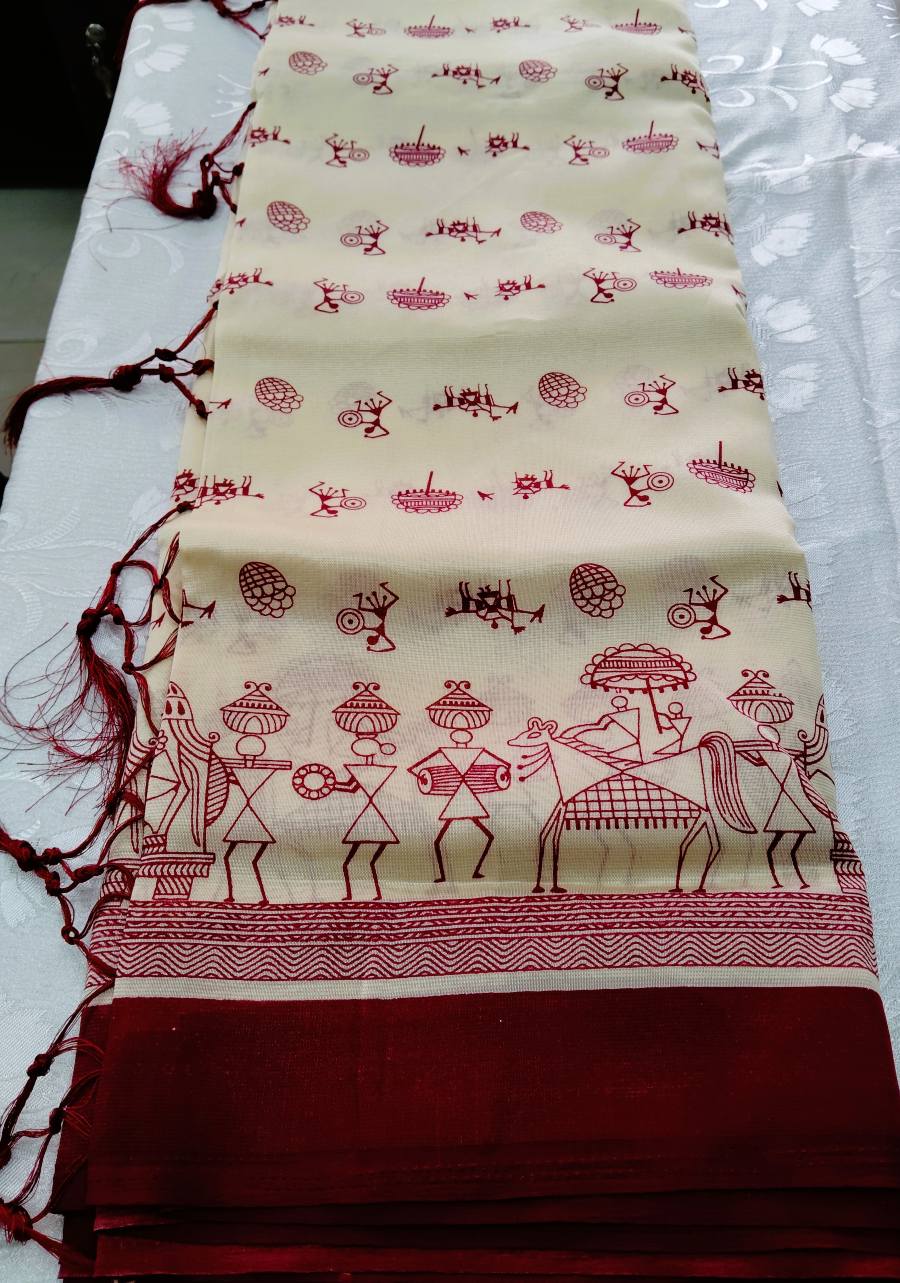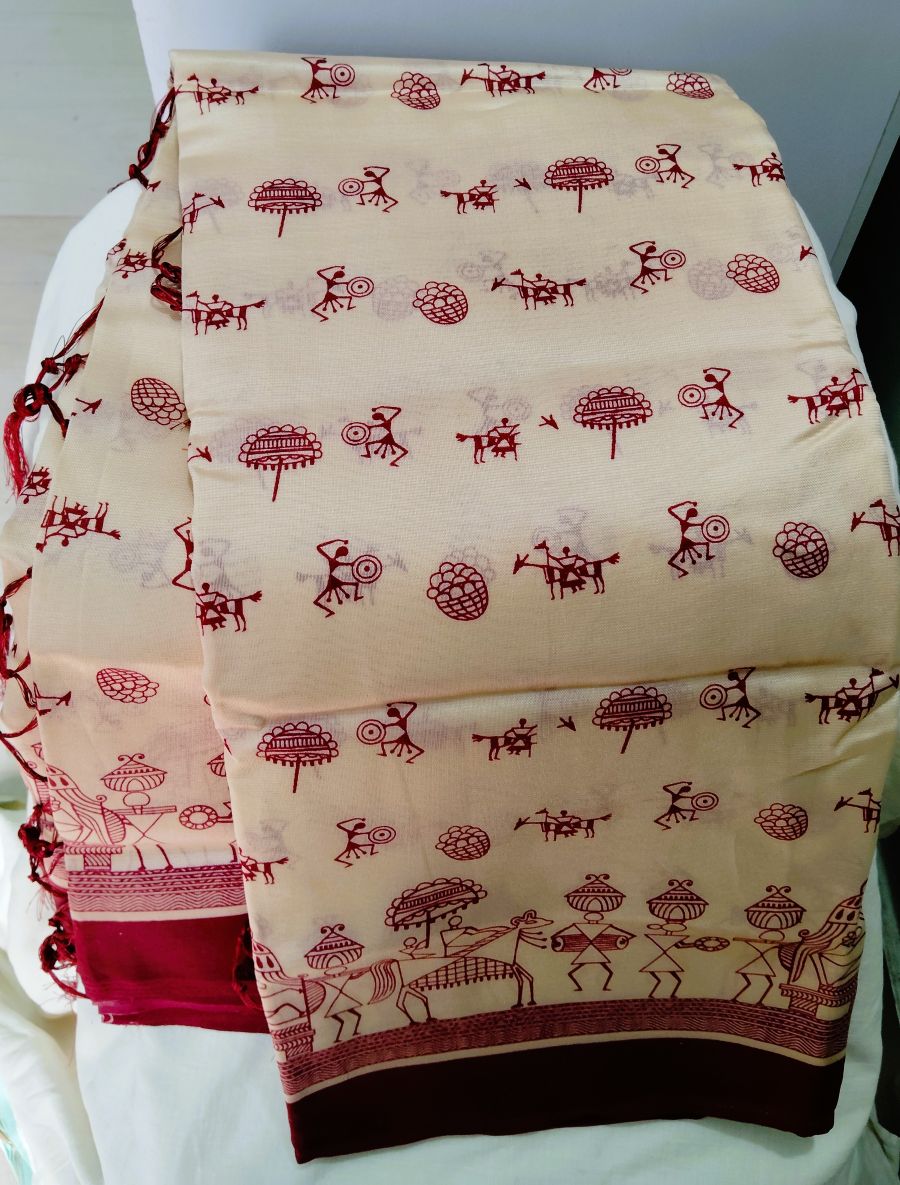 Add a touch of traditional artistry to your wardrobe with this Cream Maroon Tribal Print Cotton Silk Saree. The saree features delicate tribal-inspired motifs printed across the soft cream body, reflecting cultural heritage and folk art beauty.