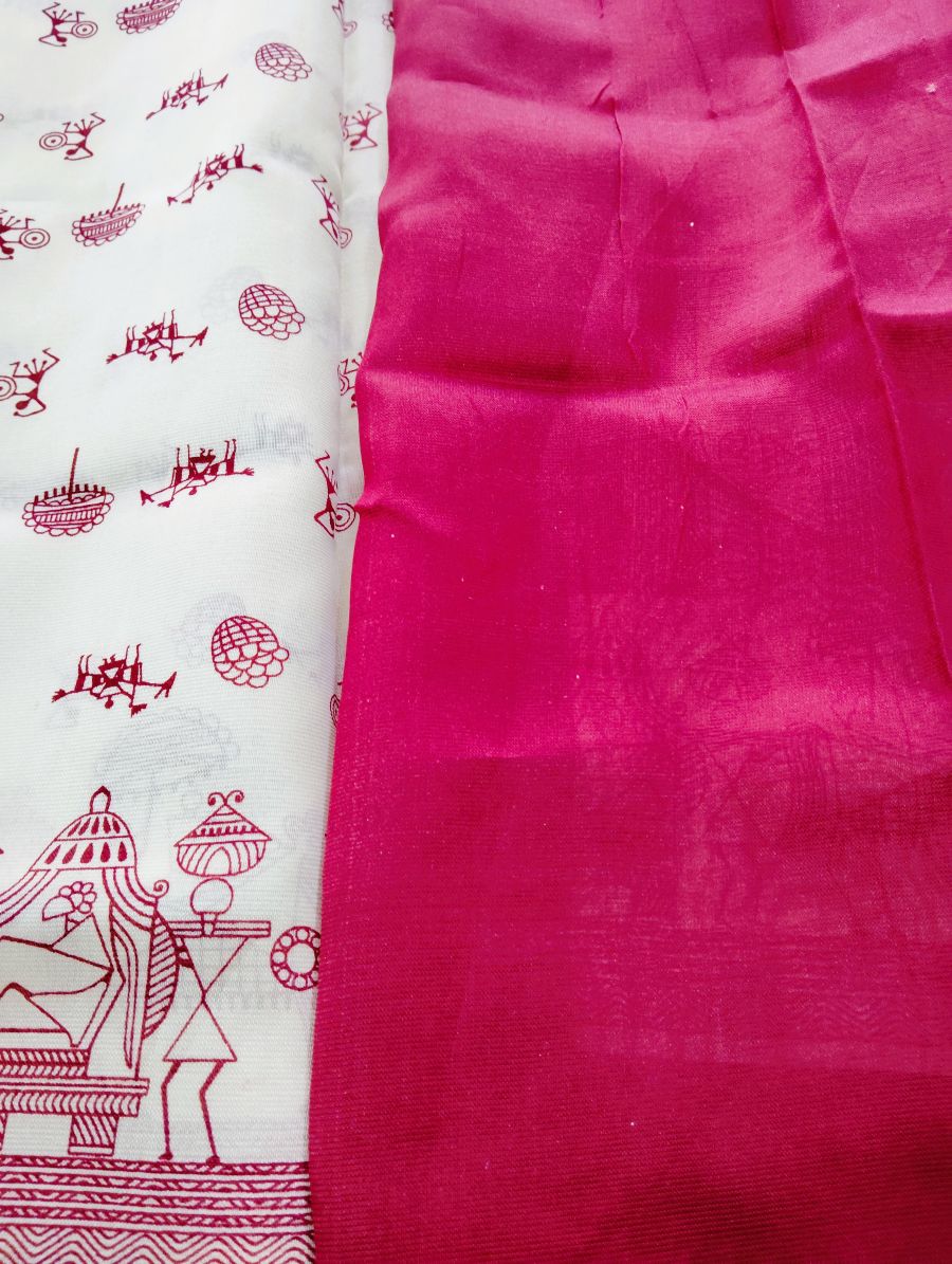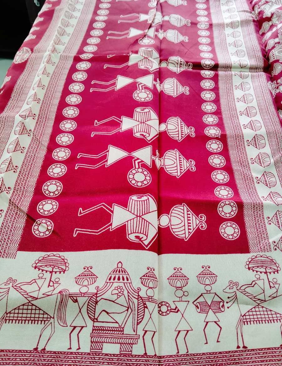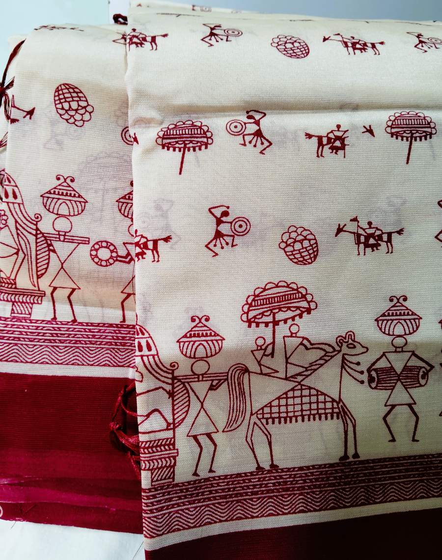 Add a touch of traditional artistry to your wardrobe with this Cream Maroon Tribal Print Cotton Silk Saree. The saree features delicate tribal-inspired motifs printed across the soft cream body, reflecting cultural heritage and folk art beauty.