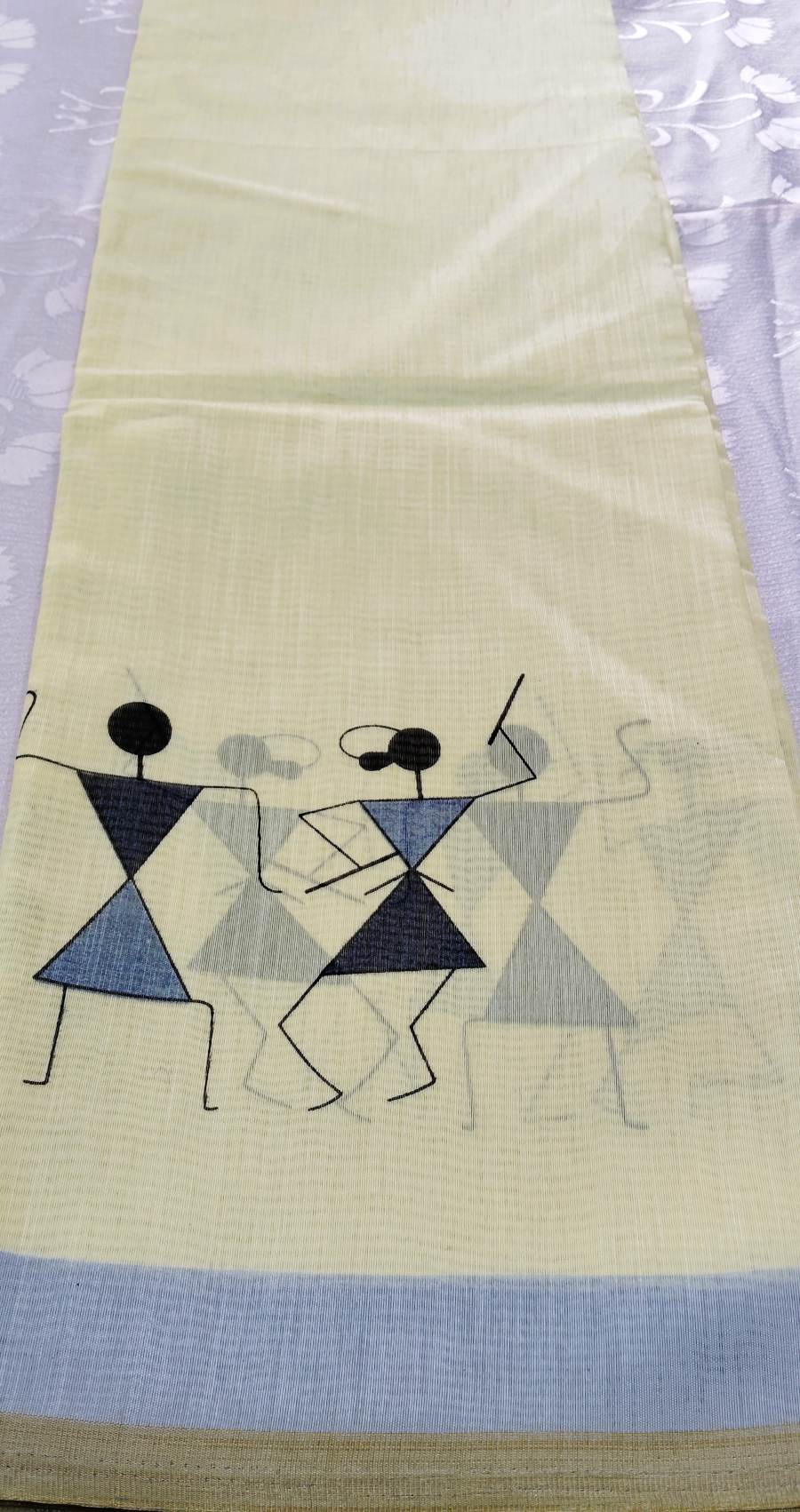Add an artistic touch to your ethnic wardrobe with this Designer Tribal Art Yellow Cotton Silk Saree designed with unique tribal-inspired prints. The saree features minimal tribal figures along the border, giving it a creative and modern ethnic look.