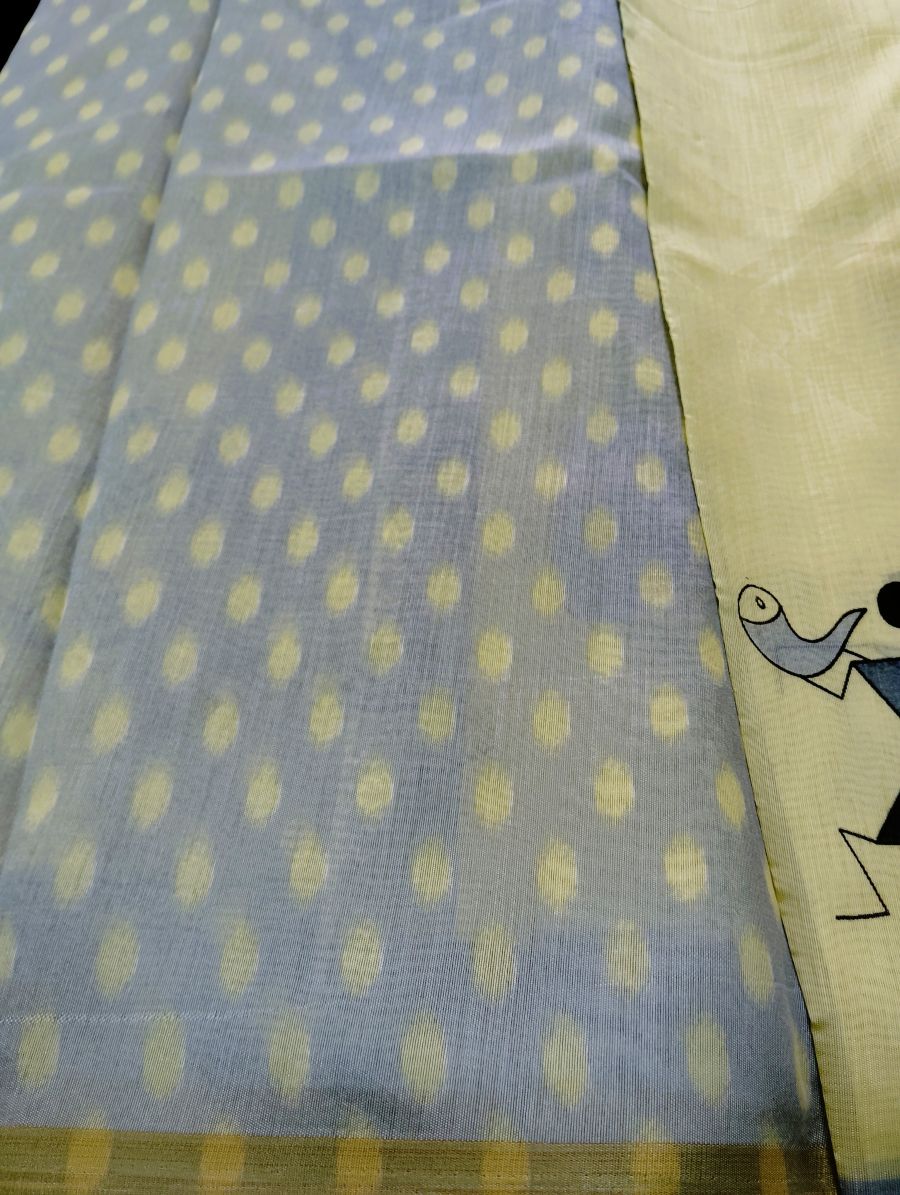 It comes with a matching grey blouse piece with dotted patterns, which complements the saree beautifully. Made from a comfortable cotton silk blend, the fabric offers a soft feel with a light sheen while remaining breathable and easy to drape.
