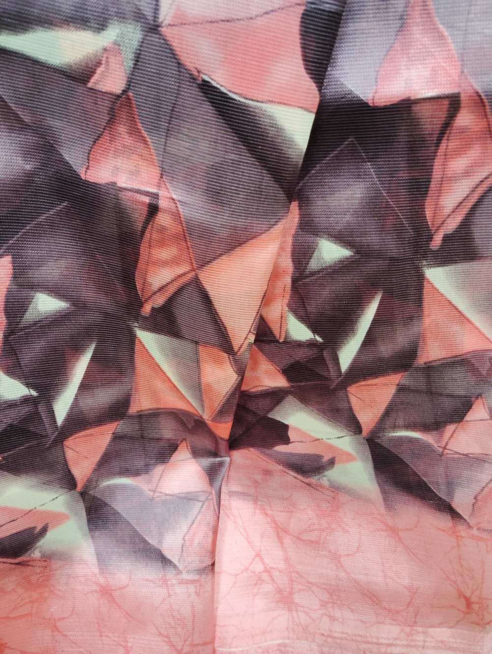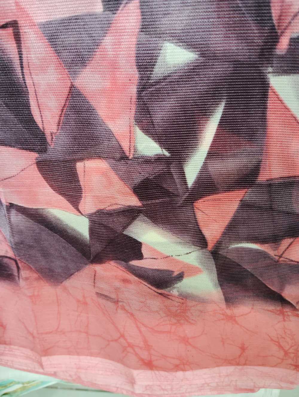 A stylish geometric printed pink abstract saree featuring modern patterns with plum and mint accents. Lightweight, elegant, and perfect for casual outings, office wear, and everyday styling.