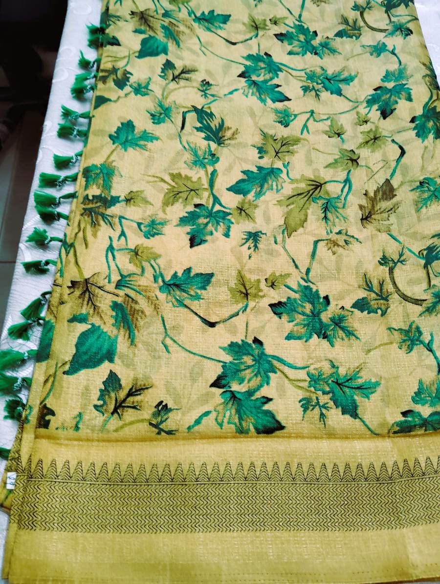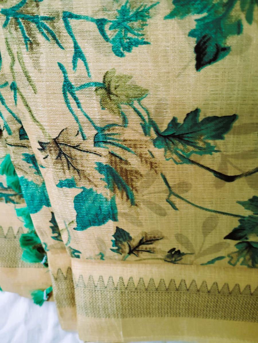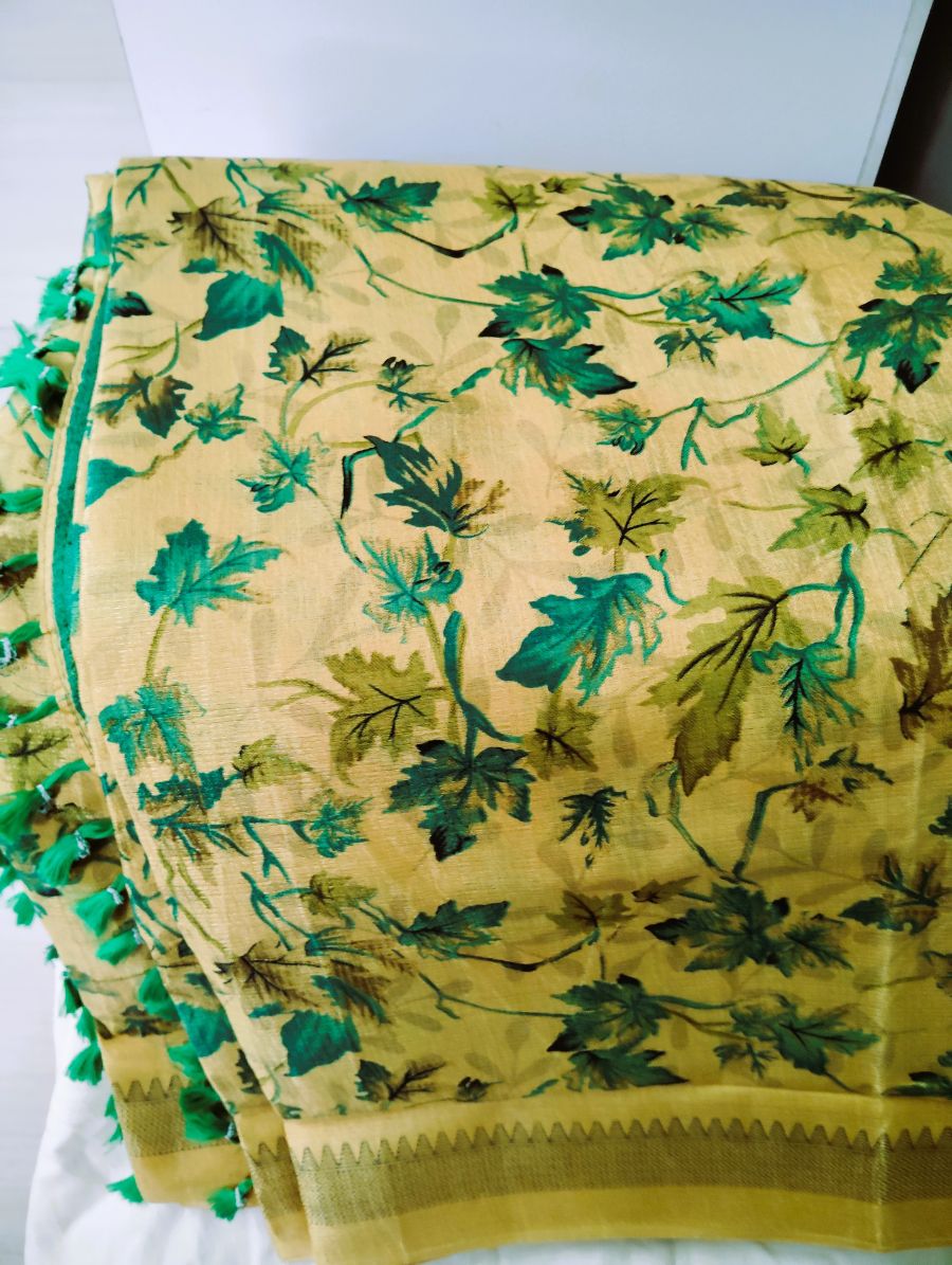 Elegant Golden Semi-Cotton Saree| Emerald Leaf Prints| Lightwear-055