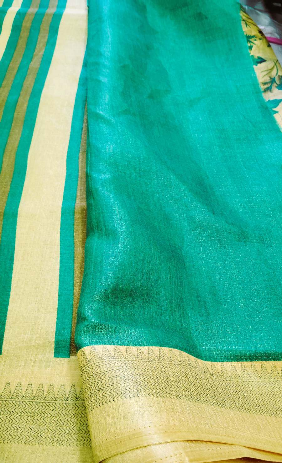 • Blouse Piece (Third Image): Comes with a coordinated solid Emerald Green blouse piece in a matching semi-cotton texture, featuring the same elegant gold zari border for a cohesive look.
