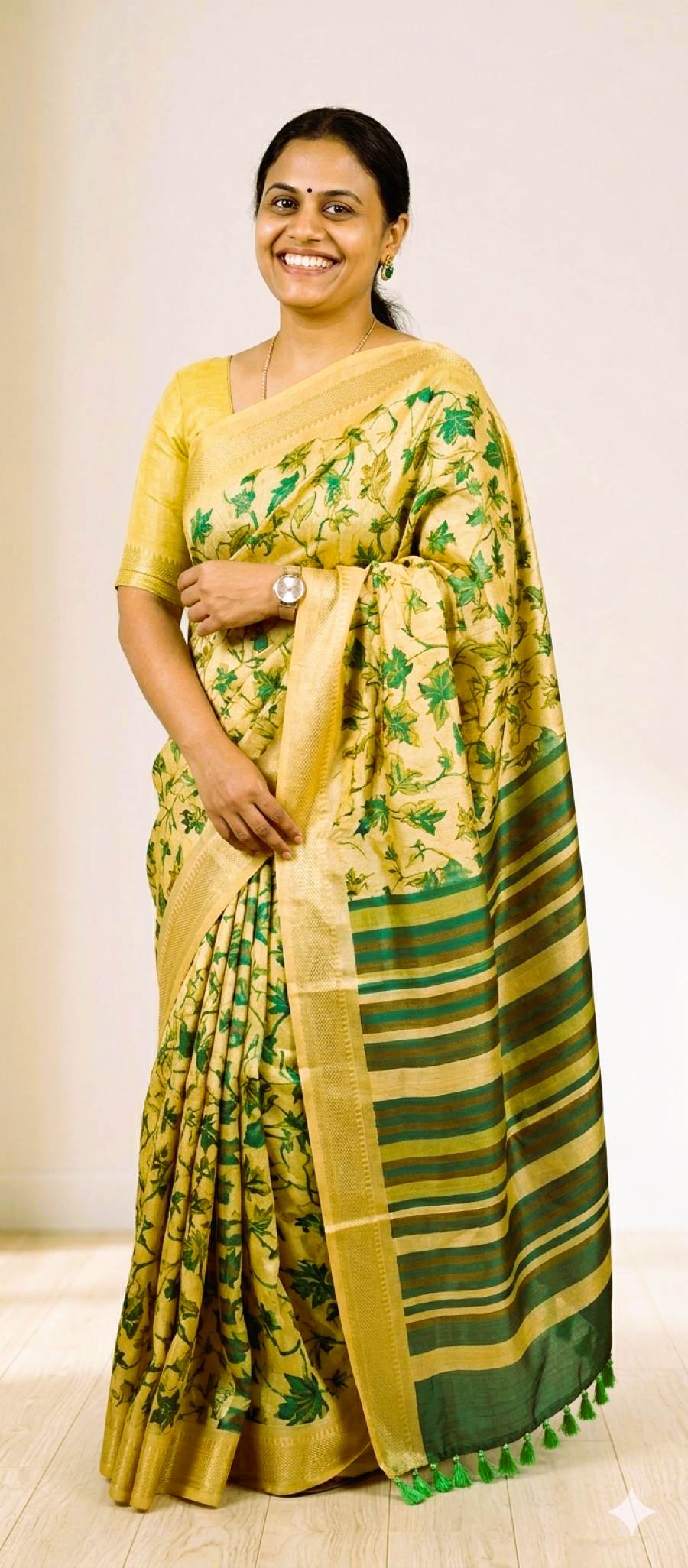 Golden Semi-Cotton Saree features a vibrant emerald green leaf print across a shimmering gold base. The body is beautifully contrasted by a sophisticated striped pallu in green and bronze tones, finished with delicate tassels.