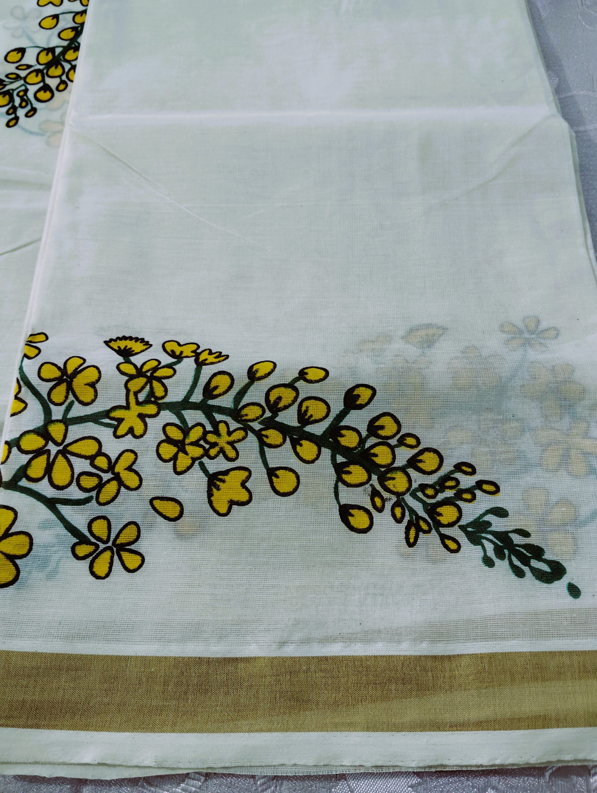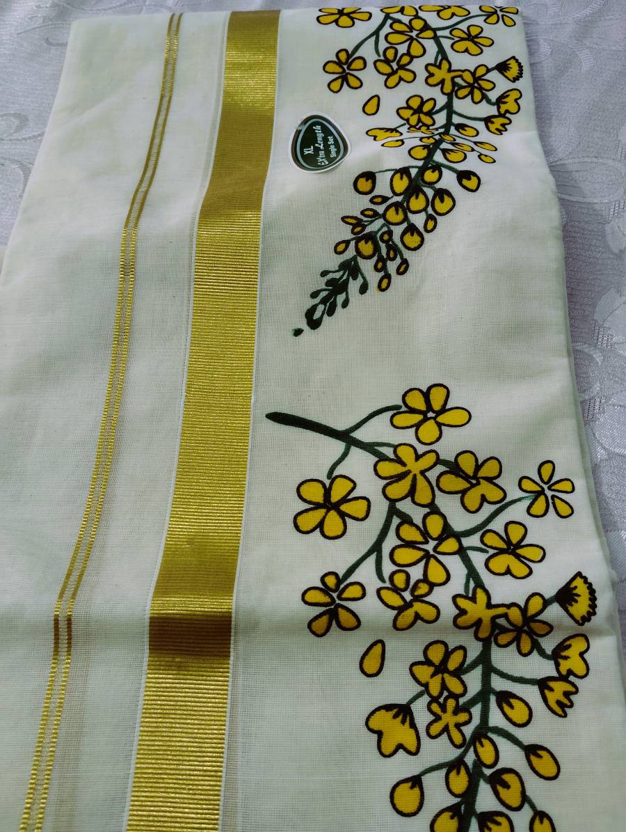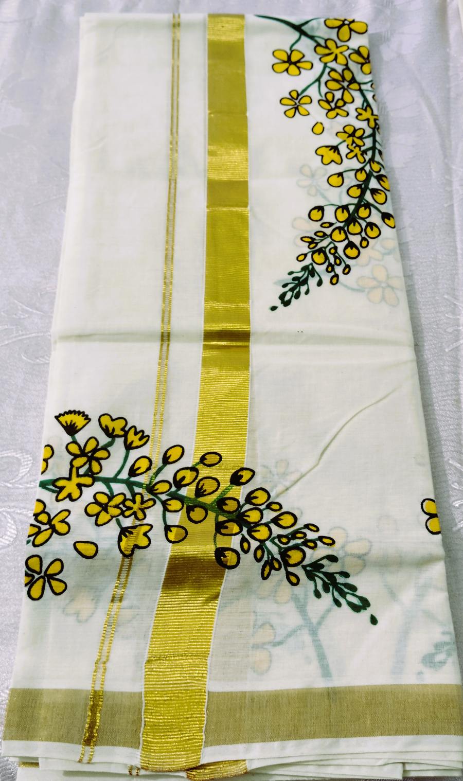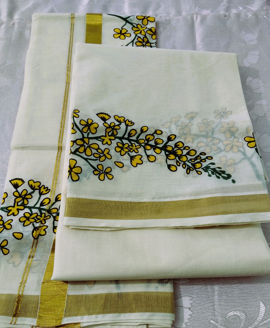 The set includes a mundu and neriyathu, beautifully decorated with bright yellow Kanikonna floral prints that represent prosperity and happiness. Lightweight and comfortable, this set mundu is ideal for festive occasions, temple visits, and cultural celebrations.