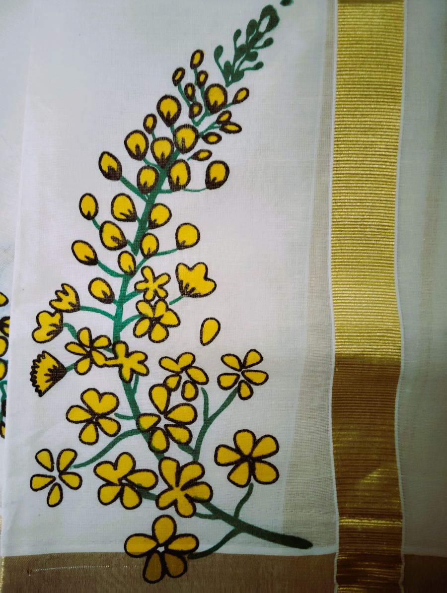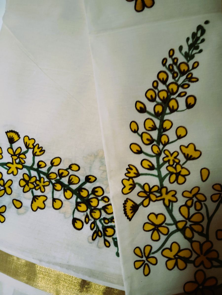 Celebrate Kerala tradition with this elegant Kanikonna Kasavu Set Mundu designed with the iconic Kanikonna flower motif, the symbolic flower of Vishu. The soft cream fabric paired with the rich golden kasavu border creates a timeless traditional look.