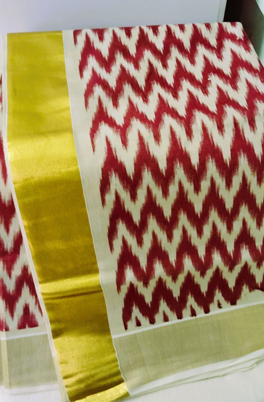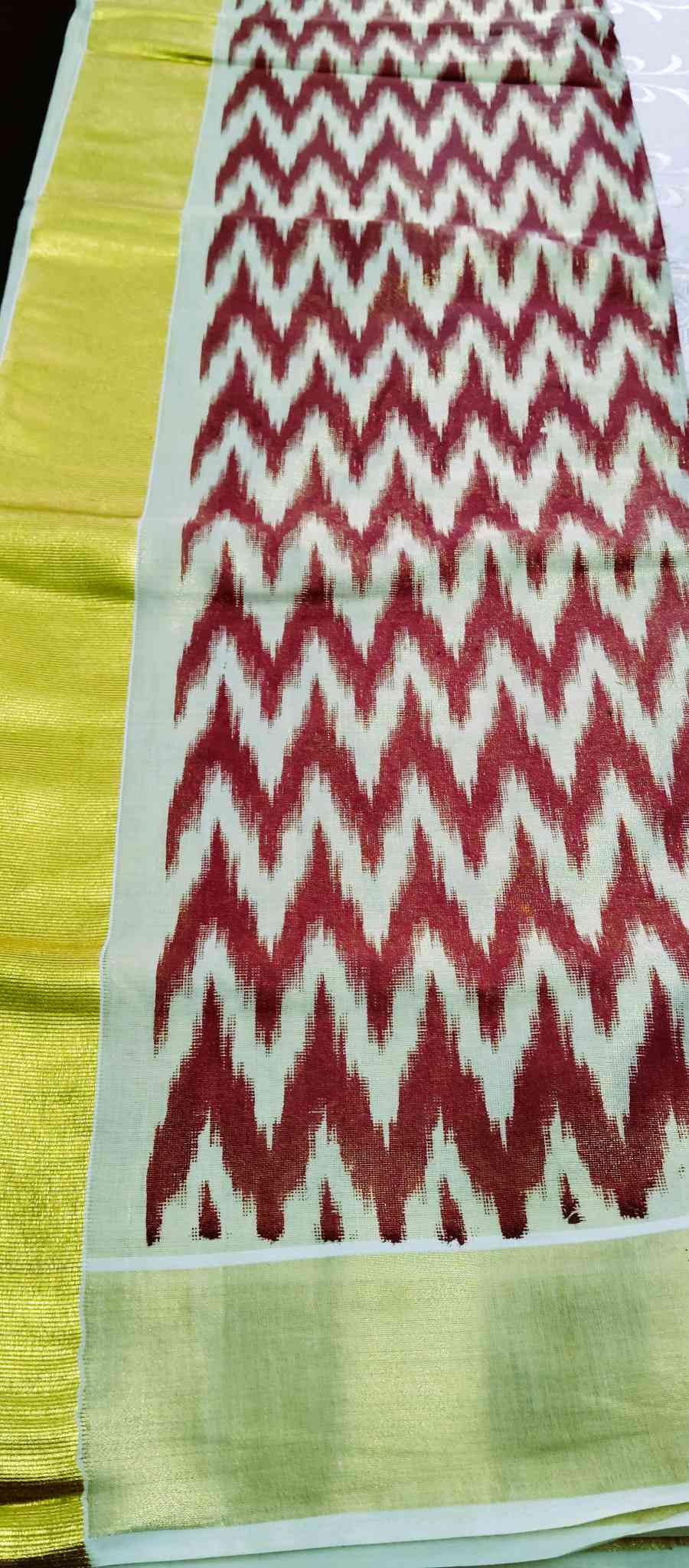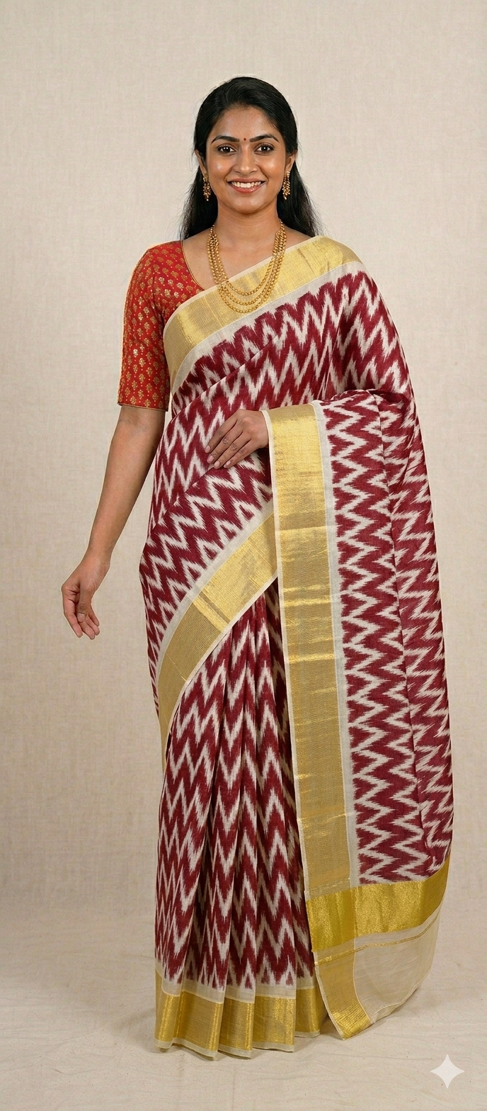 Shop maroon cotton tissue saree with golden zari border and ikat design. Lightweight, elegant, and perfect for festive and office wear.