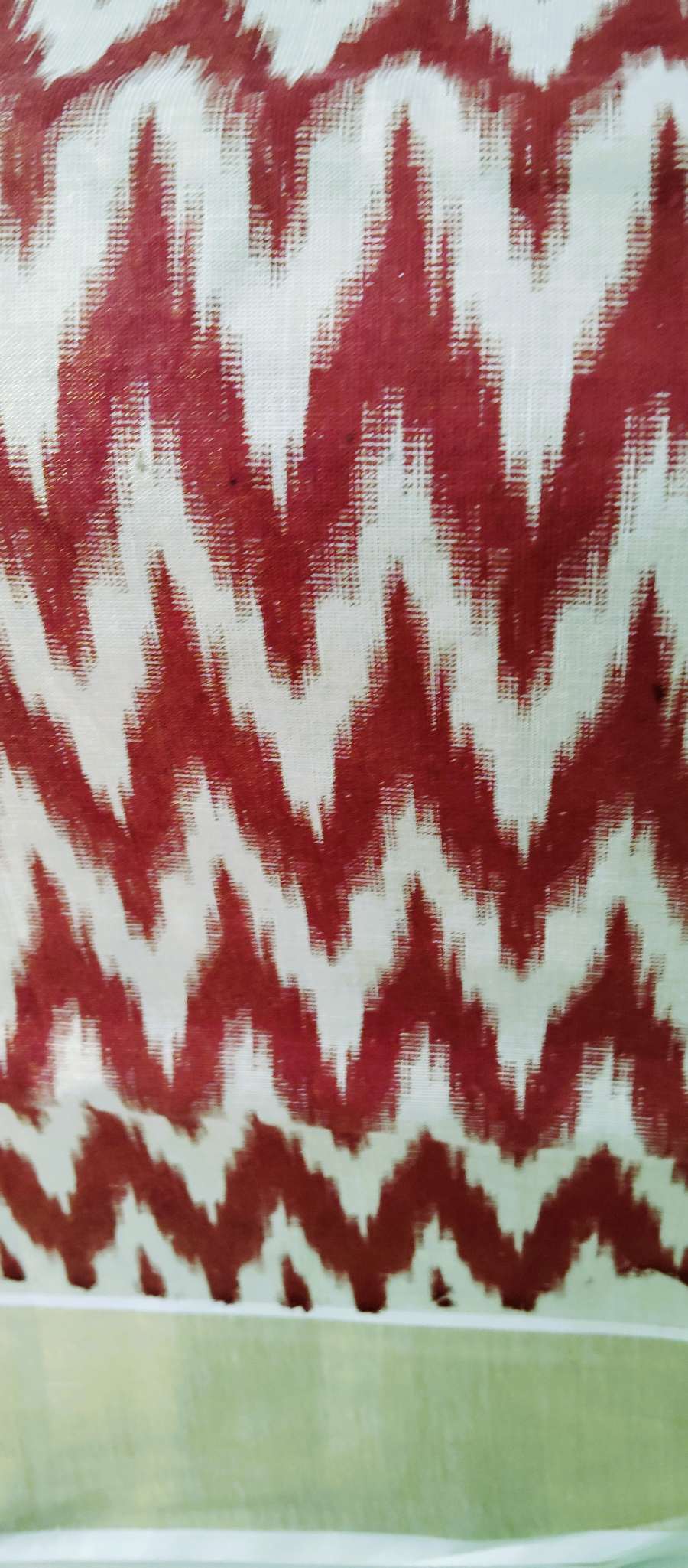 Elevate your ethnic wardrobe with this stunning maroon and off-white cotton tissue saree, designed to reflect timeless elegance and subtle luxury. The saree features a bold ikat zigzag pattern that beautifully contrasts with the soft sheen of tissue fabric, giving it a rich and graceful appearance.