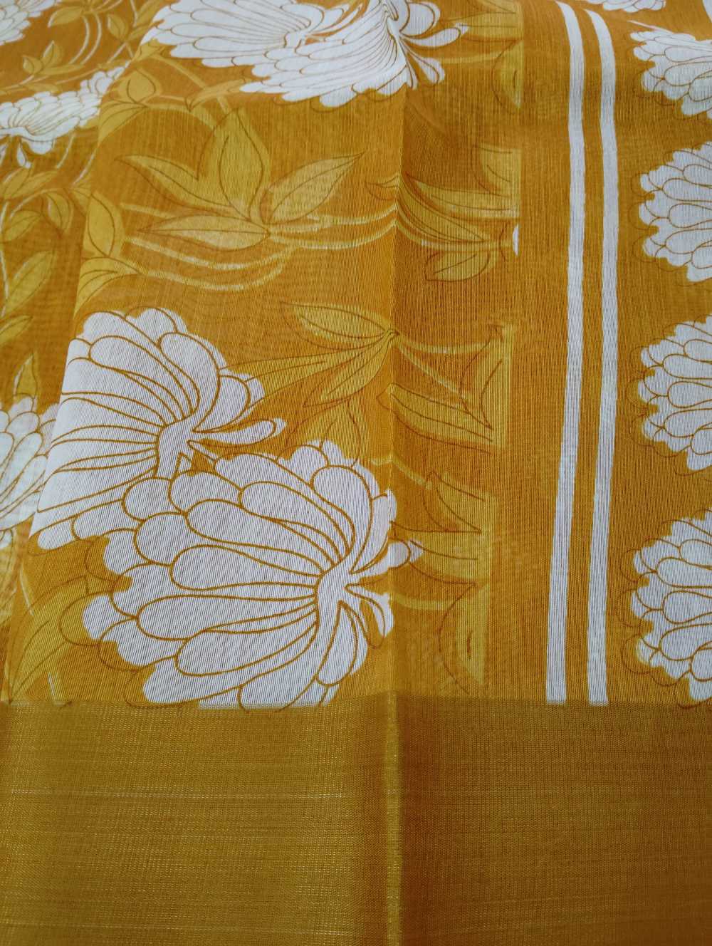 The saree features a rich mustard yellow base, beautifully highlighted with soft white floral motifs spread evenly across the body. The floral pattern is inspired by nature, with delicate leaves and blooming flowers that give the saree a calm yet sophisticated look. The contrast between the mustard yellow shade and white print enhances the overall appeal without appearing loud or heavy.