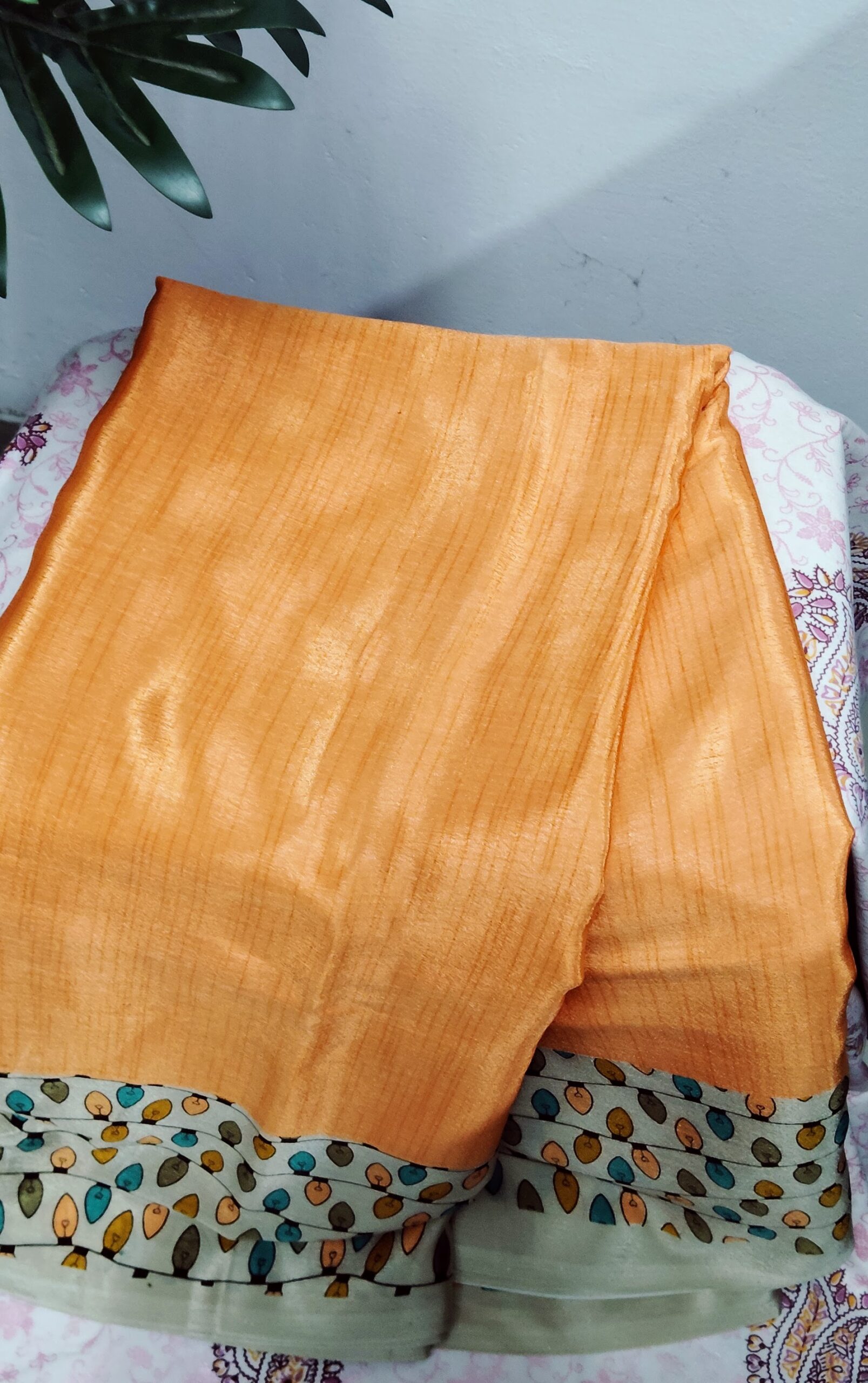 What makes Orange Chiffon Saree truly eye-catching is its unique multicolour leaf-pattern border. The border includes soothing shades of teal, mustard, olive, and soft green, adding a playful yet classy finishing touch. This printed border enhances the plain body of the saree, creating a balanced and elegant look that stands out without being overwhelming.