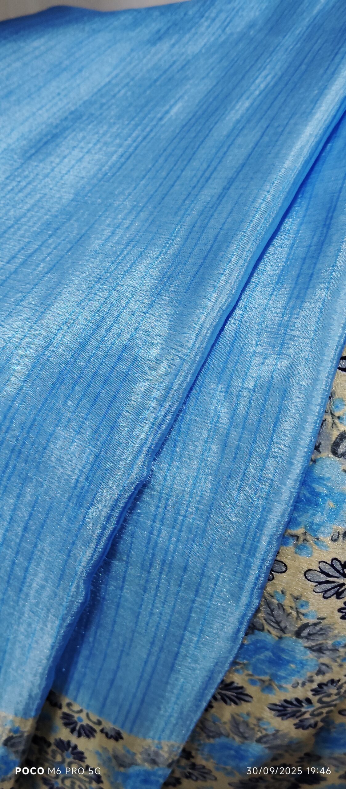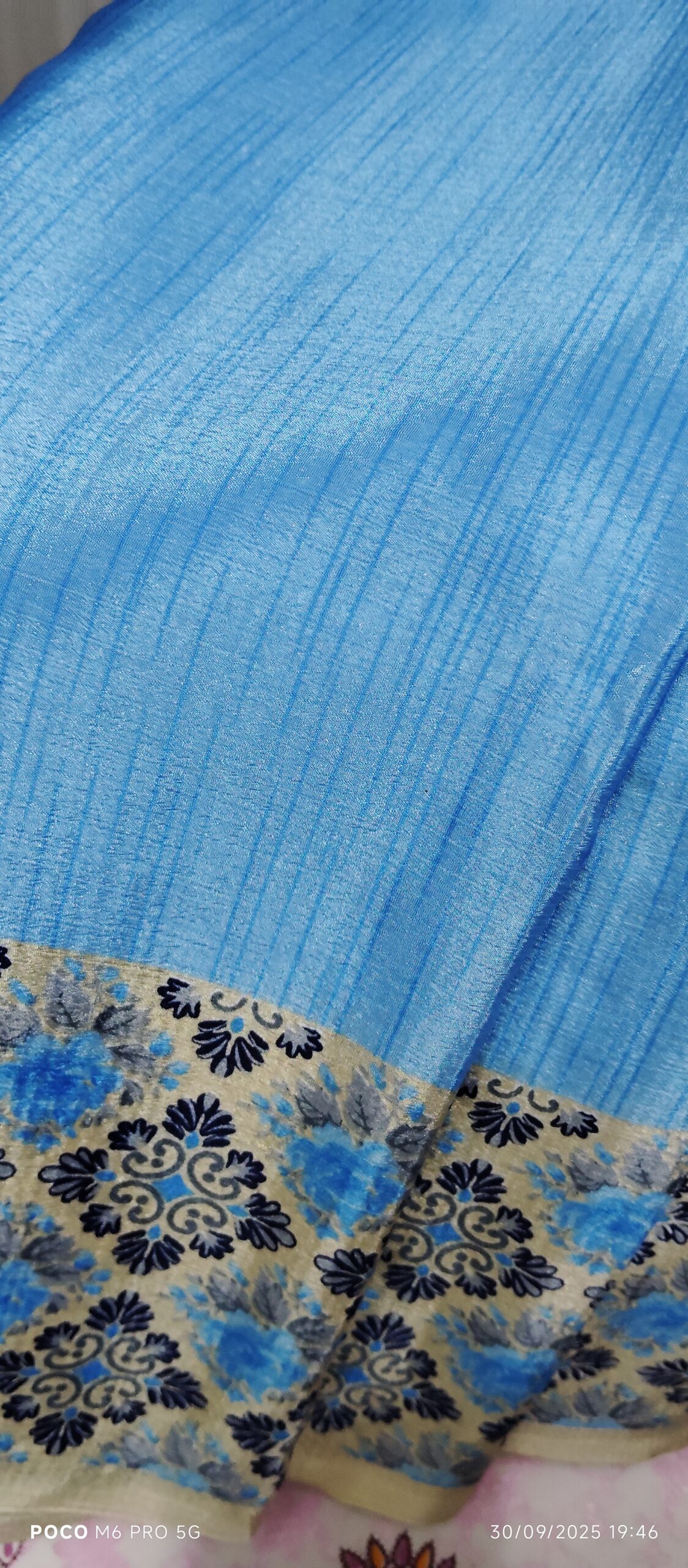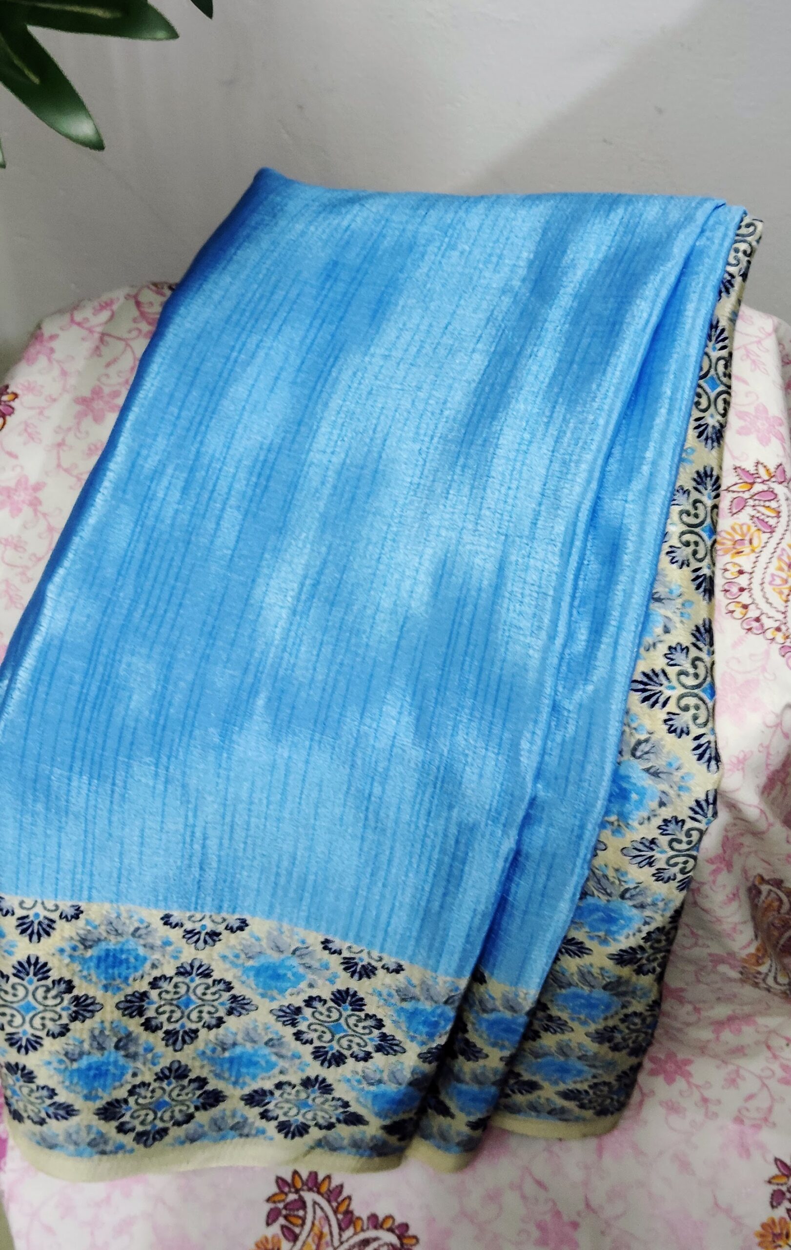 What makes Sky Blue Chiffon Saree truly eye-catching is its unique floral pattern border. The highlight of this saree is its beautiful beige and blue floral border, designed with intricate motifs that enhance the overall appeal. The border adds a royal touch, making the saree look effortlessly stylish and perfectly balanced between traditional and modern. The combination of soft texture and shimmering art silk finish gives the saree a sophisticated charm that photographs beautifully under natural and indoor lighting.