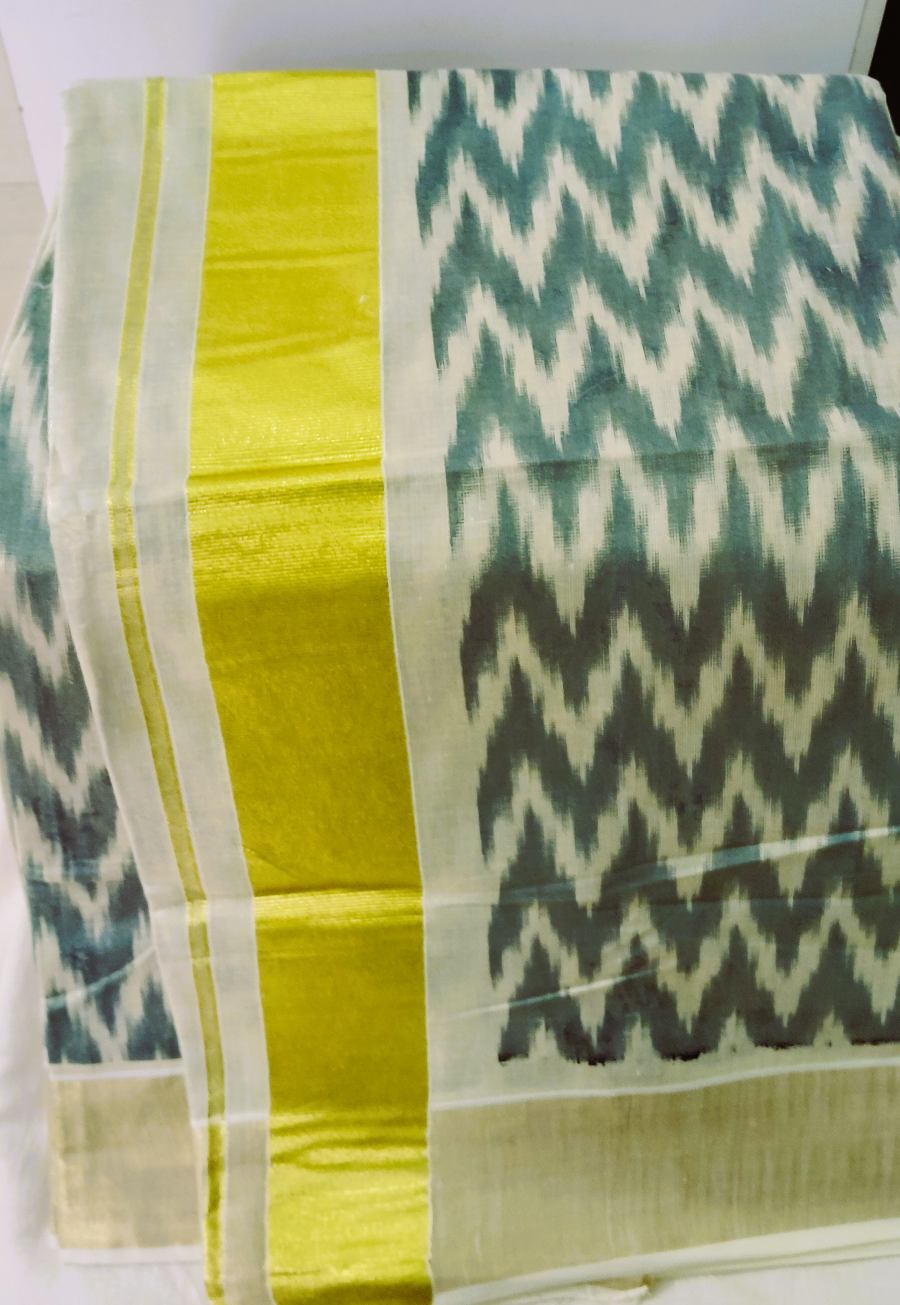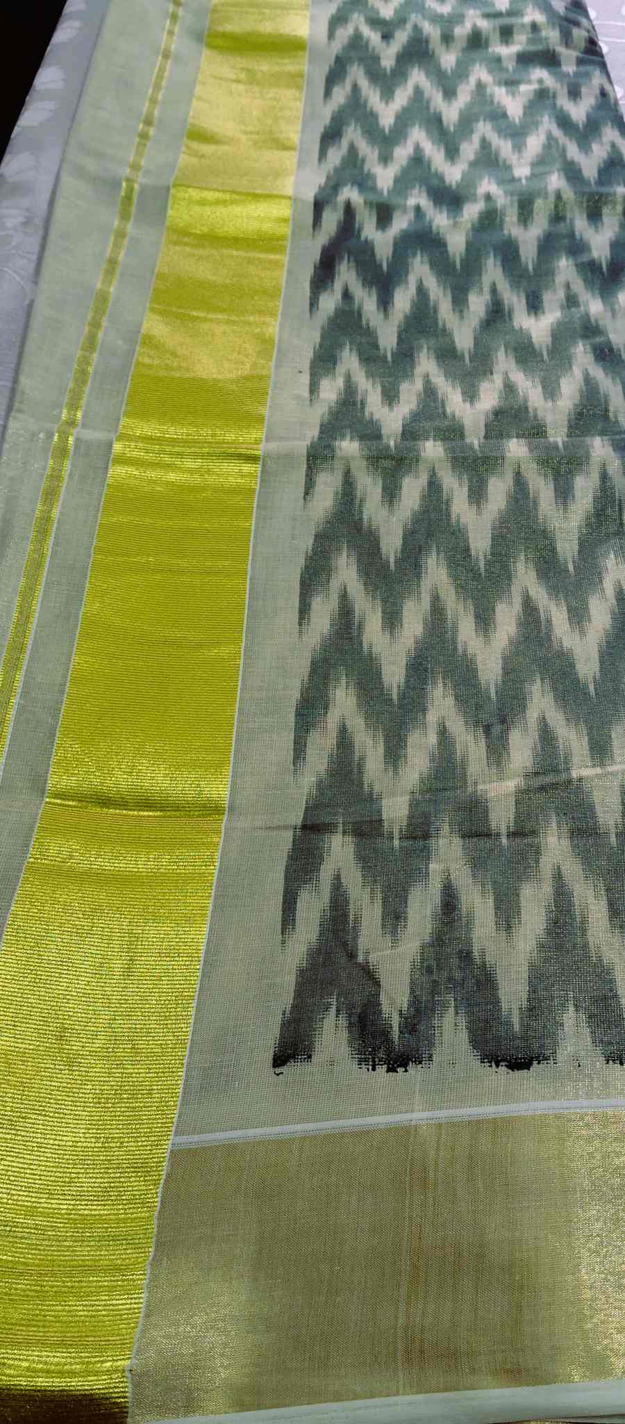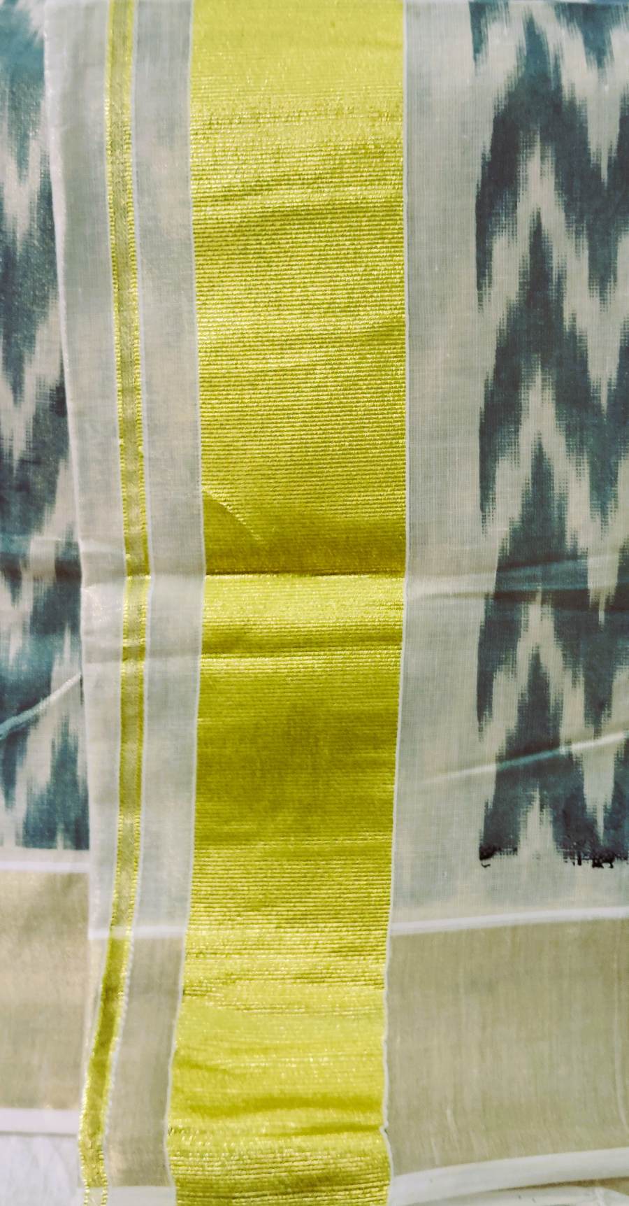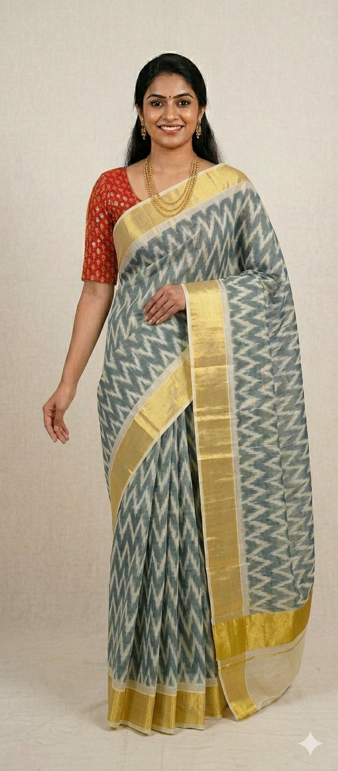 Sophisticated elegance in every fold. This Steel Blue Cotton Tissue saree is a masterclass in understated luxury. Combining the cool, calming tones of blue with the shimmering finish of tissue fabric, this saree features a sharp Ikat zig-zag pattern that creates a modern, geometric appeal.